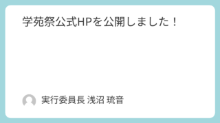 お知らせ 学苑祭公式HPを公開しました! 学苑祭公式HPを公開しました。下記リンクよりご覧ください。第78回学苑祭公式HPこれから下記の項目についても準備が整い次第、順次公開予定です。乞うご期待ください!企画紹介ステージタイムテーブル喫茶メニューグッズデジタルリーフレット落とし物・... 2026.04.14 お知らせ